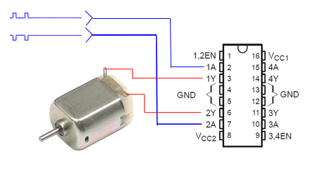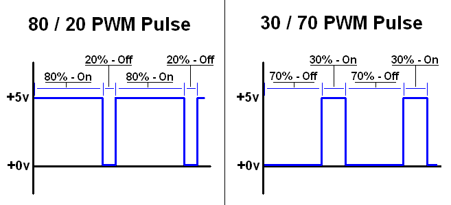 Z kolei poniższe 2 rysunki objaśniają działanie sygnałów PWM (modulacja szerokości impulsu). Pierwszy z nich pozostaje przez 80% czasu włączony – to znaczy, że napięcie +5V jest podawane przez 80% czasu trwania sygnału. Jest to „mocny” sygnał – podany na wejście układu SN754410 sprawi, że silnik będzie obracał się szybko do przodu. Drugi z sygnałów jest zbliżony do pierwszego, lecz tutaj napięcie +5V jest podawane przez jedynie 30% czasu trwania sygnału. Ponieważ przez 70% czasu trwania sygnału podawane jest napięcie 0V, układ SN754410 sprawi, że silnik będzie obracał się do tyłu z umiarkowaną prędkością. W razie podawania sygnału 50%/50% silnik nie będzie się obracał. Również poniższe 2 animacje ilustrują sposób sterowania silnika sygnałami PWM.