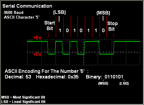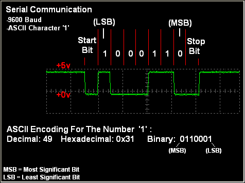 Autor omówił również sposób działania portu szeregowego i przesyłania danych przez niego. Do zobrazowania, jak wyglądają przebiegi w czasie przesyłu danych - liczb „1” (dec 49, bin 0110001) i „5” (dec 53, bin 0110101) - użyto oscyloskopu. Standardowa transmisja RS232 składa się z bitu startowego, 8 bitów danych (kodu ASCII) i bitu stopu.