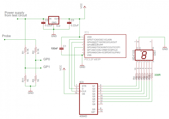 Układ składa się ze stabilizatora napięcia 78L05, mikrokontrolera PIC12F683 i rejestru przesuwnego CD4094BE (CMOS) sterującego wyświetlaczem 7-seg. Stabilizator zapewnia napięcie +5V do zasilania mikrokontrolera, przy napięciu zasilania z zakresu +5-15V. W układzie znajdują się również dwa dzielniki rezystorowe (9,1kΩ / 1kΩ, tolerancja 1%) przyłączone do wejść AN0 i AN1 procesora. Kanał AN0 służy do pomiaru poziomów logicznych, natomiast AN1 – do pomiaru napięcia zasilania układu. Kiedy wynosi ono więcej niż 5V, sonda uznaje, że pracuje z układami CMOS.