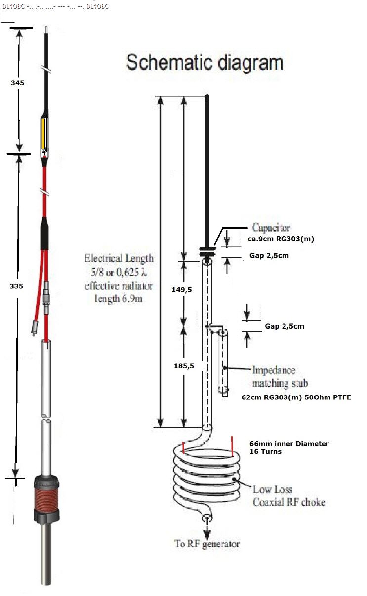 Górne ramię dipola stanowi pojedyncza linka połączona z punktem zasilania (z żyłą środkową fidera) poprzez kondensator wykonany z kawałka kabla koncentrycznego. Kondensator ten (skracający) musi być bo górne ramię dipola jest wydłużone by całość osiągnęła długość 5/8λ.