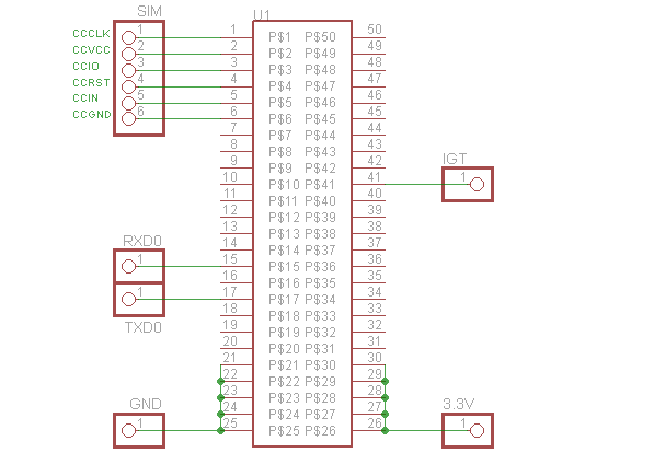Po włączeniu zasilania pin IGT musi zostać zwarty do masy na co najmniej 100ms, co spowoduje włączenie modułu. Komunikacja UART odbywać się będzie poprzez linie RXD0 i TXD0. Podłączenie karty SIM wygląda następująco: