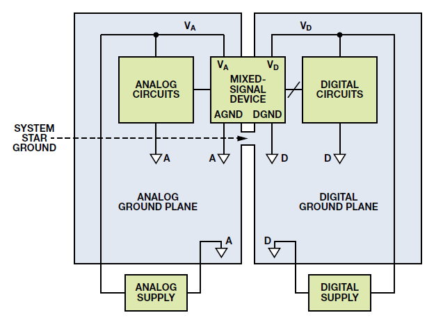Większość kart katalogowych układów przetworników analogowo-cyfrowych i cyfrowo-analogowych, a także innych układów korzystających z sygnałów tak cyfrowych i analogowych, przewiduje prowadzenie masy w obrębie jednej płytki drukowanej. Zazwyczaj jest to omówione na przykładzie modułu ewaluacyjnego producenta układu scalonego. Takie podejście prowadzi bardzo często do niezrozumienia tematu przez projektantów, którzy często projektować muszą systemy nie pozwalające na łatwe kopiowanie tych rozwiązań. Głównie mamy tutaj na myśli układy wielokartowej (tj. składające się z wielu PCB) i układu składające się z kilku systemów ADC, DAC itp.. Podstawowym zaleceniam w takim przypadku jest tutaj wytworzenie wylewek masy - osobny analogowej i cyfrowej , a także ścisłe powiązanie pinów AGND i DGND przetworników. Masy cyfrowa i analogowa muszą łączyć się w jednym centralnym punkcie, tak jak pokazuje poniższa ilustracja.