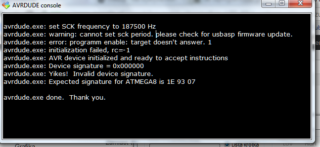 Mam pewien problem, a mianowicie USBasp ma problem z wykryciem mikrokontrolera. Sterowniki są poprawnie zainstalowane według instrukcji. Korzystam z Windows 7 w wersji 64 bitowej oraz korzystam z programu eXtreme Burner AVR. Próbowałem wykryć Atmegę8 oraz Tiny2313, wszystko bez skutku.