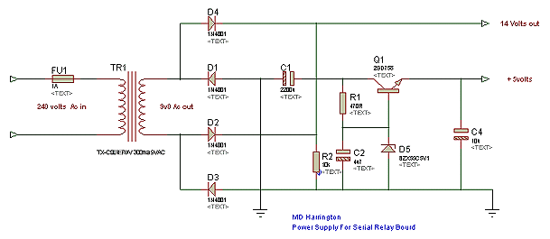 Wbudowany zasilacz (schemat poniżej) dostarcza napięć +5V (dla części cyfrowej) oraz +14V do sterowania przekaźnikami. Za pomocą przełącznika SW1 można wyprowadzić napięcie +5V na złącze D-SUB9, celem zasilania opcjonalnych zewnętrznych sterowników: klawiatury, odbiornika IR itp.
