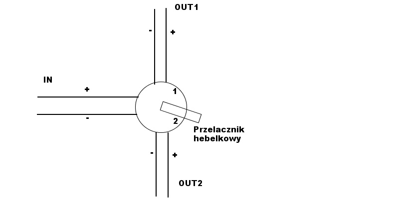 Trochę szukałem (pewnie za słabo) ale na necie wyszukałem tylko przełączniki hebelkowe typu ON/OFF a ja potrzebuję taki który zawsze jest ON ale ma dwa zamienne wyjścia jak na załączonym obrazku.