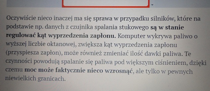 Natomiast paliwo przeznaczone fabrycznie do Junaka, czyli 72 / 74 Oktan - spalalo sie tylko do pozycji tloka 10 / 12 stopni po GMP, cykl spalania byl zakonczony i rozpoczynal sie suw pracy [ zreszta - kazdy konstruktor silnikow benzynowych do tego dazyl ].