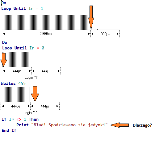 Mój mikrokontroler to atmega 644p, odbiornik IR TSOP4836 . Ciekawą sprawą jest też to, że pierwszy bit powinien trwać 2,66ms . Podczas gdy w programie, zmierzony timerem(timer1, prescaler 1), trwa 17 cykli procesora ( ~1ns )