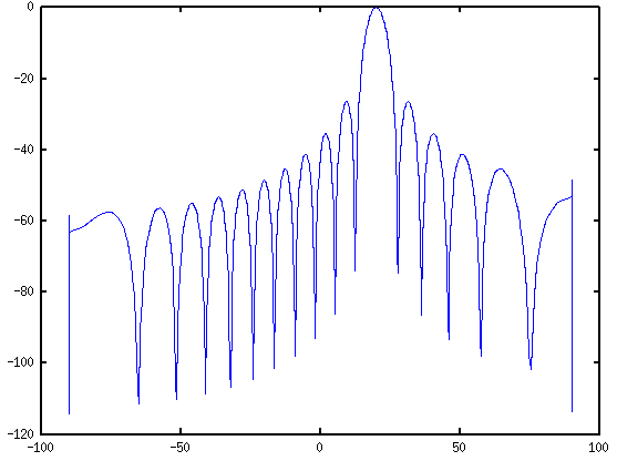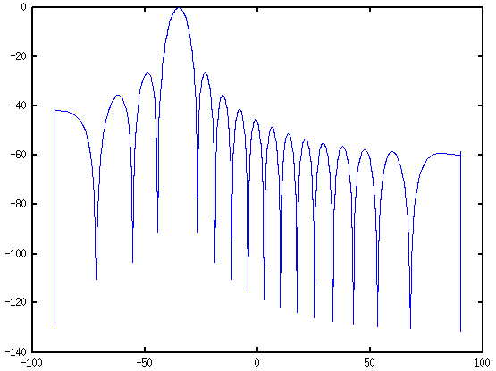 Po obliczeniu FFT na takich danych otrzymuję standardową charakterystykę anteny: