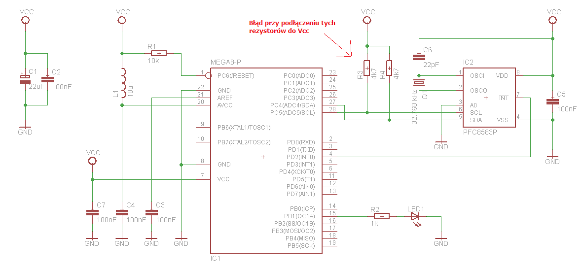 Wczoraj podłączyłem na płytce stykowej mikrokontroler ATmega8 wraz z układem zegara rzeczywistego PCF8583P. Problem polega na tym, że komunikacja przez I2C (TWI) działa, gdy odłączę rezystory podciągające linii SCL i SDA.
