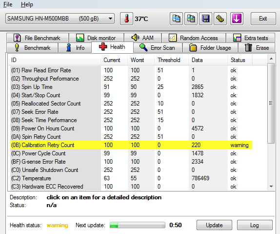 W HD tune są błędy Calibration Retry Count, nie było i nie ma problemów z dyskiem twardym (benchmark odczyt/zapis jak najbardziej ok).