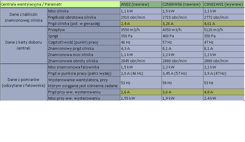 Problem zaczął się, gdy centrala w wyznaczonej projektowo częstotliwości nie mogła uzyskać odpowiedniego wydatku (zapewne za sprawą większych oporów na instalacji niż zakładał projekt). Obsługa więc podkręciła częstotliwości falowników tak by centrala osiągała projektowy wydatek. Niestety zaczęły się pojawiać awarię (błąd na falowniku motor overload). Zmierzone wartości pracy wentylatorów przedstawili również w tabeli: