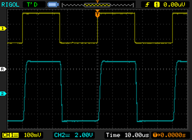 Sygnał wejściowy (prostokąt, 20 kHz, amplituda 100 mV, żółty) i wzmocniony (niebieski) można zobaczyć na poniższym oscylogramie: