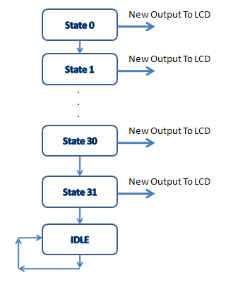 Obraz powyżej pokazuje, jakie będą kolejne kroki „programu” napisanego w VHDL. Każdy z 32 stanów odpowiada albo komendzie sterującej wyświetlaczem albo przesłaniu do wyświetlacza danych dotyczących znaku, który ma się na nim pojawić.