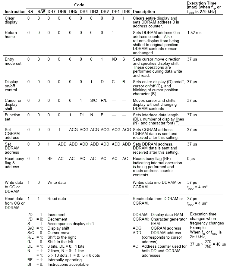 Wyświetlacz może być sterowany dwojako (co wynika z powyższej tabeli), stosując szynę danych o długości 4 bądź 8 bitów. Dzięki komendzie „Function set” można ustalić długość szyny danych, ilość pracujących linii wyświetlacza i zestaw czcionek. Większość pozostałych komend jest wykorzystywana sporadycznie.