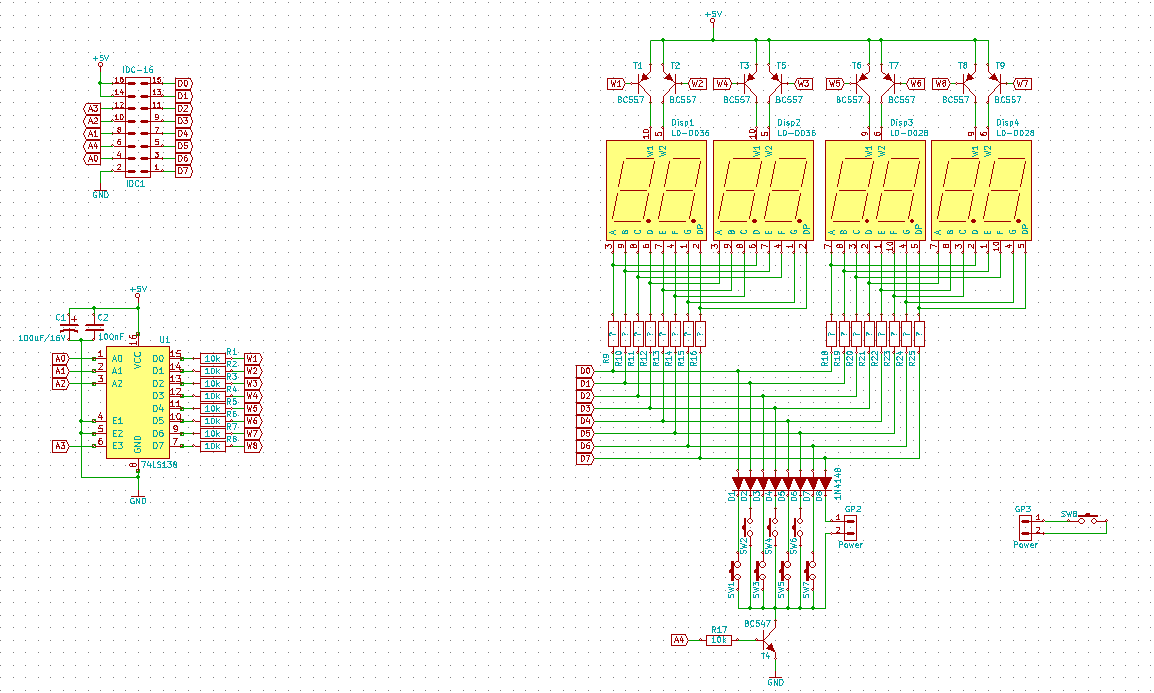 Przy czym A0..4 to sygnały adresowe które służą do załączania tranzystorów (A3 ustawia na wyjściach dekoder 74LS138 stany wysokie aby wyłączyć wszystkie segmenty), z kolei D0..7 to sygnały służące do zapalania odpowiednich segmentów wyświetlaczy LED a także służące do odczytywania klawiatury.