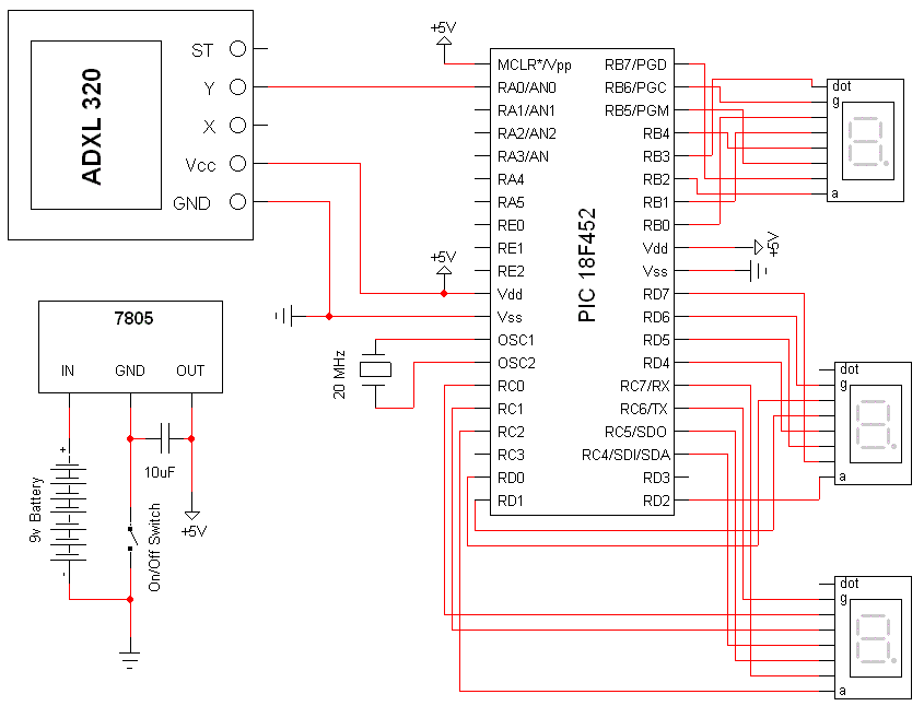 Układ składa się z trzech głównych części: czujnika przyspieszenia połączonego z wbudowanym w procesor przetwornikiem analogowo-cyfrowym, bloku zasilania i wyświetlaczy siedmiosegmentowych. Cały układ zasilany jest z 9-woltowej baterii, napięcie stabilizowane jest za pomocą układu 7805, dodatkowo wykorzystywany jest też kondensator filtrujący 10 µF. Sposób podłączania czujnika przyspieszenia jest bardzo prosty – wyjście dla osi Y przyłączone jest do przetwornika A/D procesora. Sposób podłączenia wyświetlaczy siedmiosegmentowych do procesora może na pierwszy rzut oka wydawać się niejasny – wynika to z faktu, że autor najpierw stworzył oprogramowanie dla procesora, a dopiero później rozrysował schemat i sposób podłączania wyświetlaczy.