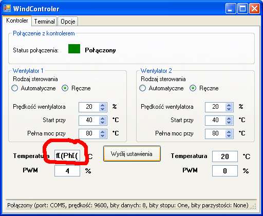 Co 1s wywoływane jest przerwanie od timera0, w którym wysyłane są dane o temperaturze i wypełnieniu PWM dwóch wentylatorów (dane w HEX, niebieskie cyfry i litery w terminalu na zdj. 2). Chciałbym, aby dane te były wpisywane w odpowiednie pola do tego przeznaczone (TextBoxy na zdj.1). Nie wiem, jak to zrobić. Może ktoś z was ma pomysł?
