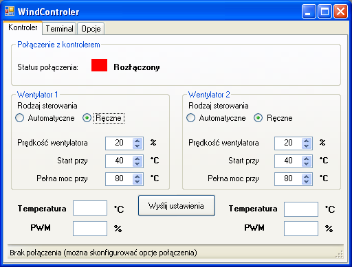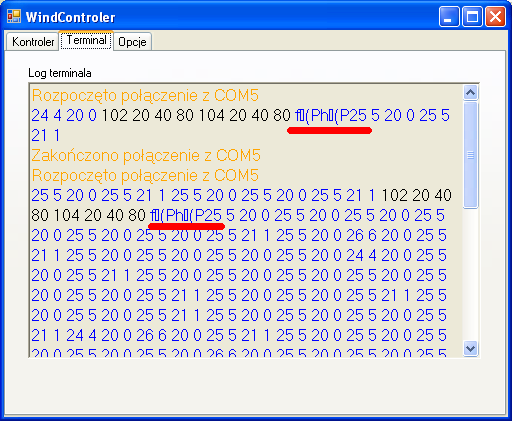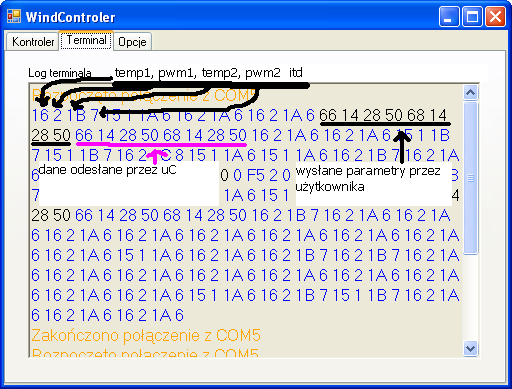 Dodatkowo z programu wysyłane są dane ustawiające niektóre parametry pracy wentylatorów ([rodzaj_sterowania prędkość_wentylatora start_przy pełna_moc_przy] czarne cyfry i litery w terminalu na zdj.2). Są one wysyłane ręcznie, na żądanie użytkownika. Ich wysłanie powoduje wywołanie przerwania w uC. Jak to zrobić, aby te parametry były prawidłowo zrozumiałe i wykonane na uC? Dlaczego dane te są następnie odsyłane przez uC? Nie mam takiej funkcji w kodzie (a może o tym nie wiem