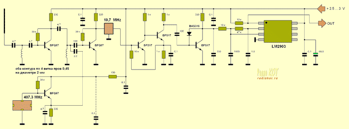 Nadajnik - układ bez cech szczególnych. Jest również zoptymalizowany dla wartości zasilania 2,5-3V.