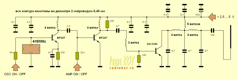 Moc przy napięciu 3V wynosi 50-70mW. Pobór prądu - ok. 60mA. Moc można zwiększyć, podłączając nadajnik do zasilania powyżej 5V, a jej wartość może osiągnąć 120-150mW. Przy tym wartość prądu wzrośnie do 120mA, co może być niebezpieczne dla stopnia końcowego. W przypadku zwiększenia napięcia zasilania, najlepiej zastosować tranzystor 2SC3357 w stopniu końcowym bez wprowadzania dodatkowych zmian w schemacie.