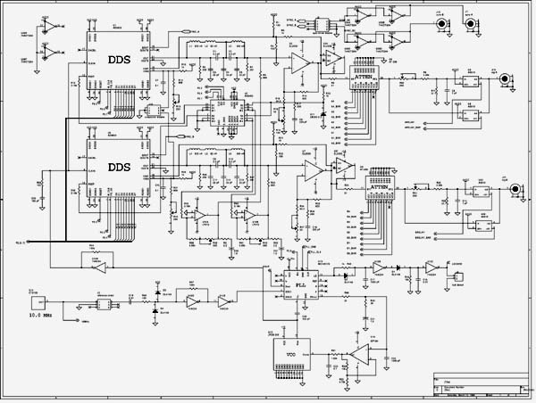 Sercem syntezera są dwa układy DDS firmy Analog Devices – AD9850. Układy te stanowią źródło sygnału sinusoidalnego, umożliwiając regulację jego częstotliwości i względnej fazy. Stopień wyjściowy układów DDS zawiera także osobne dla każdego z dwu kanałów, regulowane tłumiki. Regulacja tłumienia możliwa jest w zakresie od 0,0 do 63,9 dB co 0,1 dB. Użytkownik może więc regulować tu pięć parametrów: częstotliwość sygnału i tłumienie dla każdego kanału oraz względną fazę pomiędzy dwoma generowanymi sygnałami.