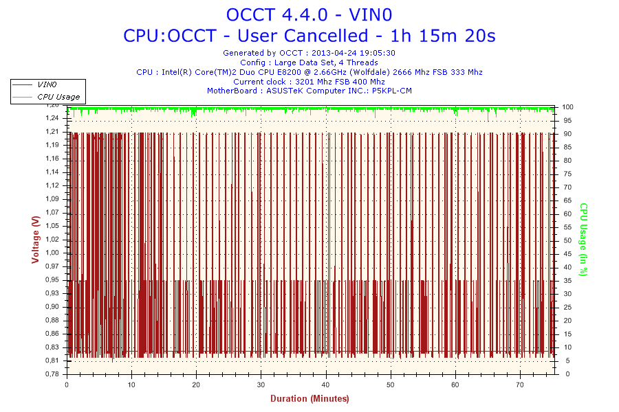 Krótko i zwięźle - podkręciłem procesor Pentium E8200 z 2,66 GHz na 3,2GHz. Nie bawiłem się w zmiany napięcia (nie wiem czy to w ogóle będę robił), podwyższyłem po prostu FSB. Po podkręceniu na półtorej godziny zapuściłem OCCT. Niepokoi mnie jeden ze wskaźników (reszta trzyma normę), a mianowicie VIN0, proszę spojrzeć: