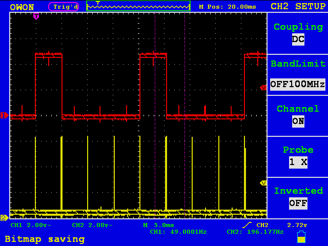 Poradziłem sobie z problemem. Program jest napisany dobrze. Wstyd się przyznać, ale źle sobie ustawiłem wyzwalanie w oscyloskopie. Zamykam, problem rozwiązany.