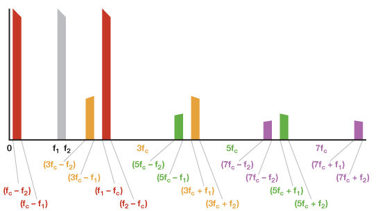 Kolejne wykres pokazuje widmo sygnału wyjściowego gdy pasmo sygnału przechodzi przez fc, przez co produkty modulacji harmonicznymi nośnej nakładają się - (3fc – f1) < (fc + f1). Z uwagi na to pasma fundamentalne nie mogą być już w prosty sposób odseparowane od harmonicznych z użyciem prostego filtra dolnoprzepustowego. Teraz, aby wyseparować sygnał użyteczny, musimy zastosować filtr pasmowoprzepustowy.