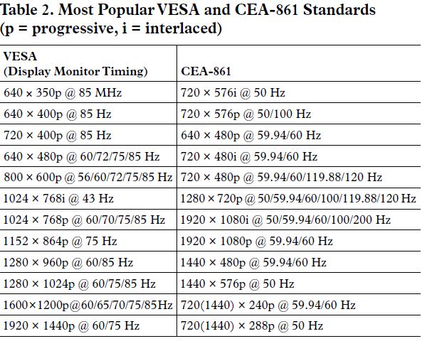 Zależności czasowe sygnałów w interfejsach VGA i HDMI są zdefiniowane osobno przez dwie wspomniane powyżej grupy: VESA oraz CEA/EIA. Formaty danych VESA mogą zostać odnalezione w dokumencie pod tytułem "VESA Monitor Timing and Coordinate Video Timings Standard", natomiast zależności czasowe aplikowane w interfejsie HDMI znaleźć można w wspominanej już specyfikacji CEA-861. Specyfikacja VESA opisuje standardy takie jak VGA, XGA, SXGA używane głównie w komputerach osobistych i laptopach. Z kolei w specyfikacji CEA-861 odnajdziemy standardy takie jak 480p, 576p, 720p oraz 1080p, które wykorzystywane są w telewizorach i wyświetlaczach ED/HD. Spośród tych wszystkich formatów tylko jeden jest konieczny i wspólny dla obu standardów - VESA o CEA-861. Jest to 640 × 480p @ 60 Hz. Wszystkie urządzenia - telewizory i monitory komputerowej - muszą wspierać ten tryb pracy, z uwagi na to wykorzystany on zostanie jako przykład w tym artykule. Poniższa tabelka pokazuje porównanie pomiędzy innymi, popularnymi standardami.