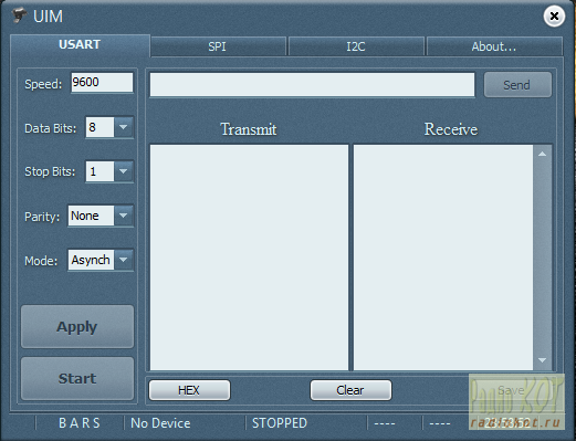 Jest on dość prosty, każdy interfejs posiada pewną ilość ustawień. Co ważne każdy z interfejsów może pracować tylko pojedynczo. W momencie podłączenia urządzenia do komputera, w oknie programu pojawią się przyciski, których kliknięcie spowoduje uruchomienie odpowiedniego interfejsu. Następnie wystarczy wpisać dane w pole w określonym formacie i kliknąć przycisk „Send”. Każdy interfejs posiada swój format danych. Poniżej je dokładnie omówię: