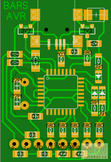 Jest to próbna wersja urządzenia, dlatego można znaleźć niewielkie różnice w porównaniu ze schematem płytki przedstawionym powyżej. Autor zdecydował, że nie potrzebuje wyjścia SS do pracy SPI i go nie zamontował. Jednak jak się później okazało, był to błąd, gdyż tryb Slave bez niego nie działa. Po wymaganych poprawkach całość działa jak trzeba.