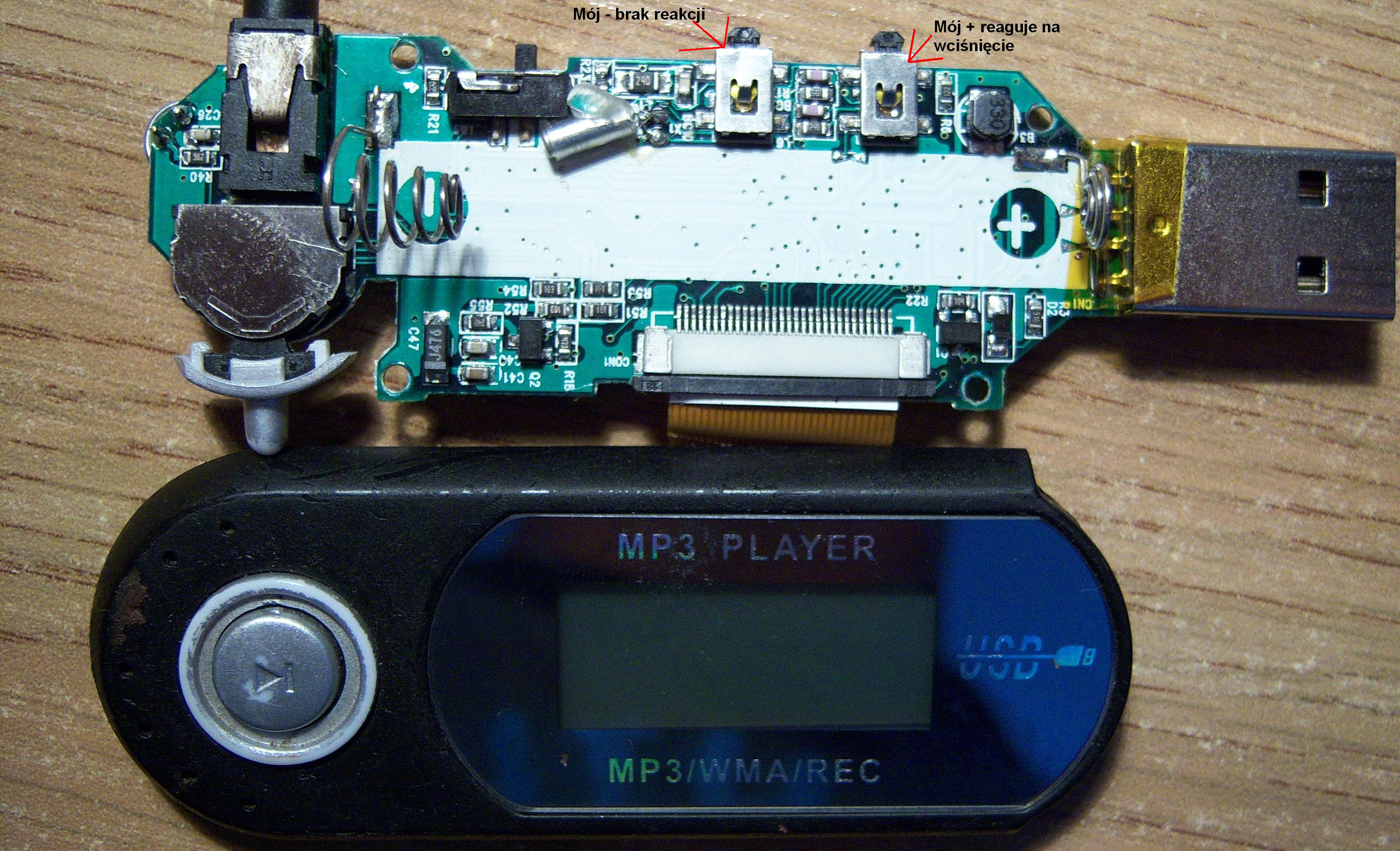 Witam otóż posiadam w/w model mp3 rozebrałem i nie wiem czy dobrze złożyłem volume + i - bo można odwrotnie założyć. I Właśnie już wcześniej zwiększanie siły głosu nie działało ale zmniejszyć się dało. Nie wiem czy może jakoś połączyć/zewrzeć styki aby zwiększyć głos. A może oprogramowanie lub jakiś soft. Aktualnie zrobiłem format mp3 wgrałem nowe piosenki i dalej volume 00. Dodam że wszystkie guziki działają na pewno oprócz tych od głosu, mp3 reaguje na mój + (ekran się podświetla) na mój - brak reakcji.