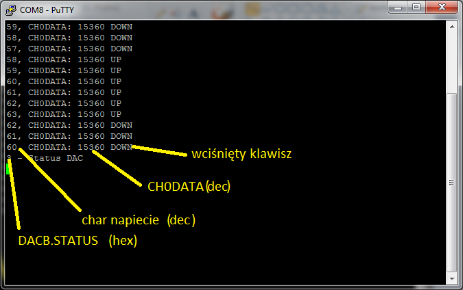 Za zmianę wartości DAC mają odpowiadać funkcje odpowiednio k_up() oraz k_down(), które inkrementują/dekrementują wartość zmiennej, oraz wyświetlają ją na terminalu. W pętli while znajduje się reakcja programu na komendy z terminala (kliknięcie strzałki w górę/dół).