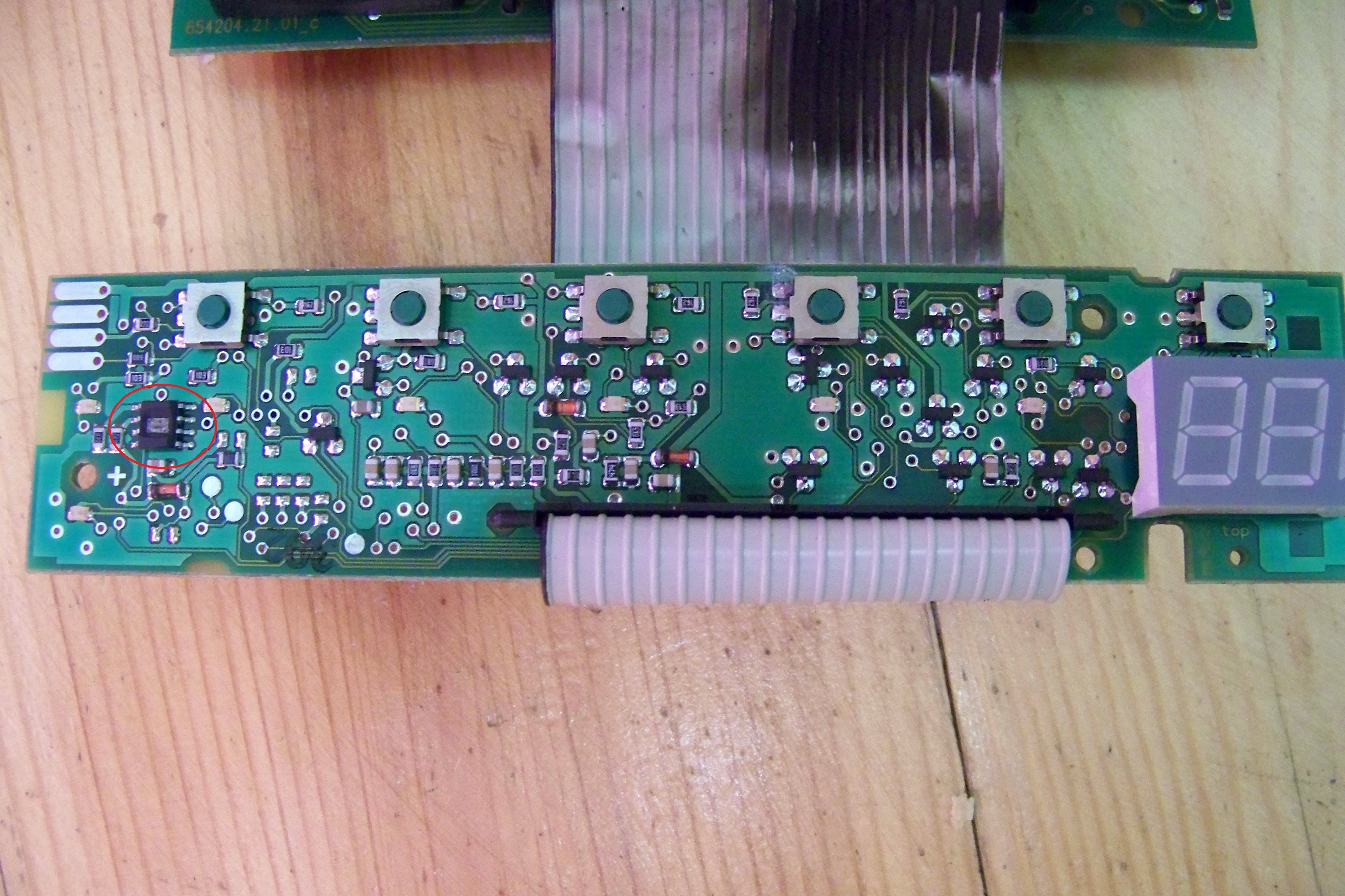 Spalił się również układ 7805 (moduł numer 2 - tutaj po wymianie) i podłączeniu pod zasilacz - wszystko zdechłe diody wszystkie się świecą, a wyświetlacz pokazuje 00. Po dalszych oględzinach (moduł 1) zobaczyłem ze eksplodowała kość pamięci EEPROM.