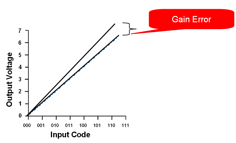 Innym niezwykle istotnym parametrem jest błąd wzmocnienia. Tak jak można się domyślić opisuje on o ile nachylenie funkcji przejścia badanego przetwornika DAC różni się od ideału. W idealnym układzie nachylenie wynosi w 1 LSB, jednakże bardzo często, w realnym układzie, wartość ta różni się delikatnie od idealnej. Tak jak w przypadku offsetu możemy dopasować do dwóch punktów na krzywej funkcji przejścia funkcję liniową postaci y = mx + b. Wzmocnienie równe jest m, a jego odchyłka od jedności jest właśnie błędem wzmocnienia układu. Poniższy wykres pokazuje krzywą idealną i rzeczywistą obarczoną błędem wzmocnienia.