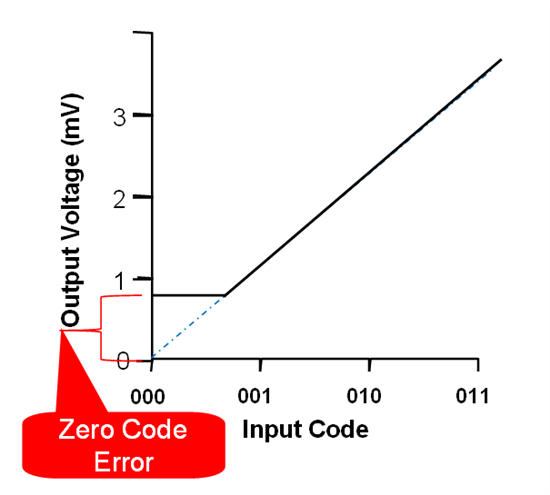 Błąd kodu zerowego, to parametr bardzo podobny do offsetu, niezwykle pomocny do oceny zachowania przetwornika DAC. Błąd kodu zerowego mierzy się jako sygnał wyjściowy przetwornika gdy na jego wejście cyfrowe podane są same wartości zerowe. W przypadku idealnego przetwornika cyfrowo-analogowego sygnał analogowy na wyjściu powinien wynosić 0. Jednakże z uwagi na parametry analogowe układów wyjściowych przetwornika obserwuje się odchyłkę od idealnej wartości. Parametr ten ilustruje poniższy wykres: