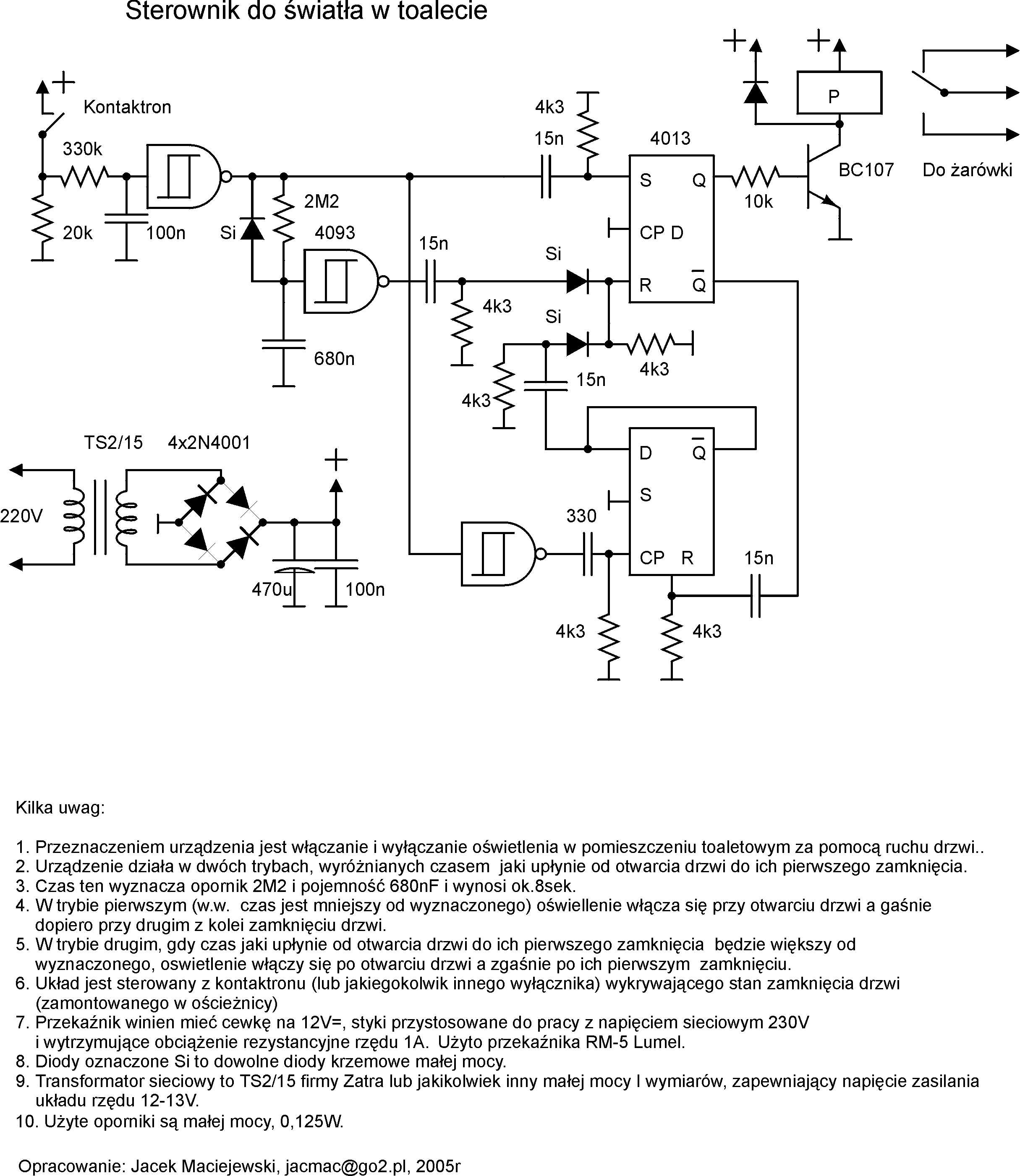 Zamieszczam coś dla początkujących, aby nie przepadło w niepamięci. Jest to prosty ale użyteczny automat do włączania i wyłączania światła w toalecie za pomocą drzwi. Położenie ich jest wykrywane mikrowyłącznikiem i przekładane na stan oświetlenia, lecz nie całkim banalnie tylko w sposób uzależniony od czasu dzielącego otwarcie drzwi od ich zamknięcia. Układ nie zawiera krytycznych elementów i powinien działać od razu o ile nie zostanie popełniona jakaś pomyłka. W istocie działa u mnie nieprzerwanie od 15 lat