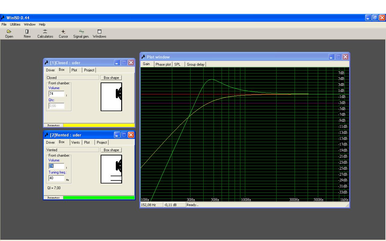 posiadam obudowę zamkniętą 74 litry .Parametry wpisałem do programu winisd i otrzymałem oto takie wyniki w obudowie bass refleks i zamkniętej 74 l .Głośnik napędza axton c608 filtr dolnoprzepustowy 40-240 Hz , wiec obudowa bass refleks strojona pod 40 Hz .Która z obudów zagra lepiej ? , samochód to mercedes 124 sedan.