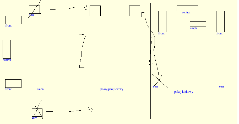 Czyli duży głośnik z dużym i to do prawego kanału, to samo do lewego. A te małe podsufitowe to między te dużo jeszcze czy do osobnego wyjścia w ampli speakers B, wolałbym aby to wszystko było w speakers A, można też wykorzystać że ampli ma 5.1. Właściwie to mam dwa zestawy głośników 5.1 czyli cztery fronty, cztery tylne i dwa centralne, suby niekonieczne. Może dałoby się je wszystkie podpiąć i zrobić tak żeby łatwo było ten drugi zestaw odpiąć. Jeden zestaw nagłaśnia jeden pokój, drugi salon a amplituner jest przenoszony. Teraz chce chwilowo na kilka godzin spiąć oba zestawy ale po kilku godzinach je rozłączyć aby był znow jeden zestaw.