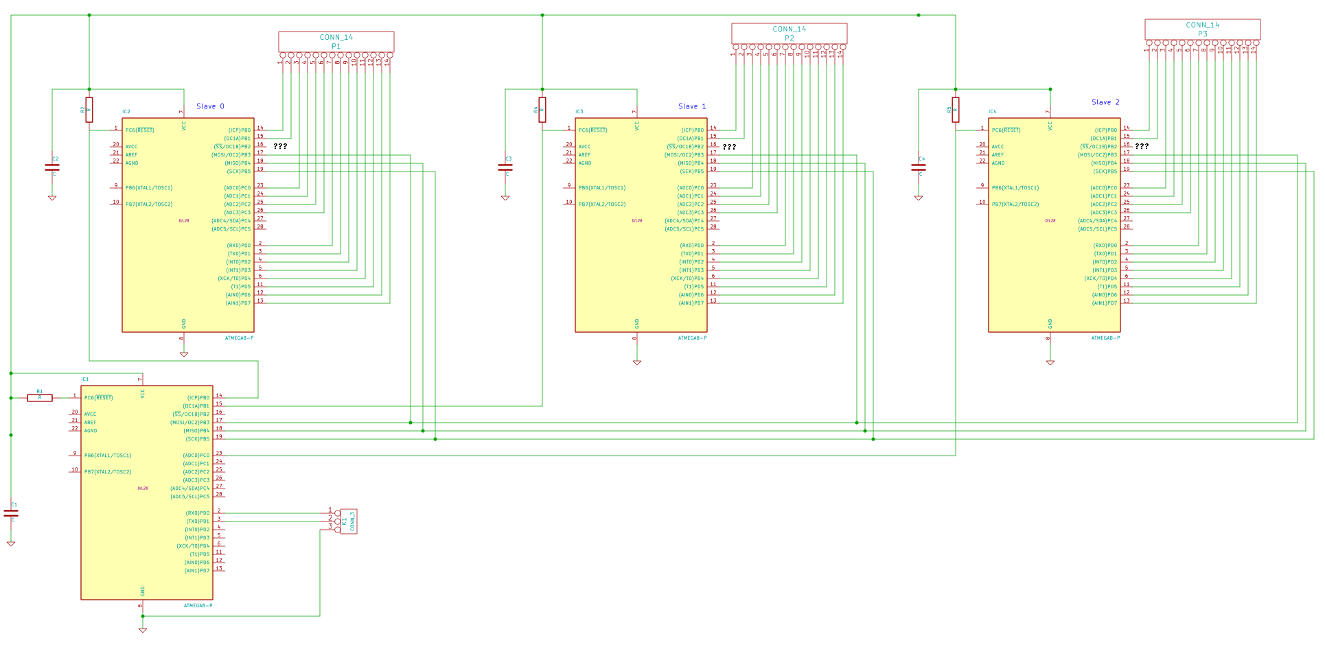 RESET zachowuje się trochę jak Slave Select (SS) - w stanie niskim włącza tryb programowania więc każdy procesor ma wyprowadzony RESET do Mastera. Master wybiera, który procesor programować za pomocą odpowiedniego pinu (tutaj 14, 15, lub 23 w masterze), który ustawia w stan niski na czas programowania i resztę wykonuje tak samo jak programator USBasp czy jakikolwiek inny programator ISP. Pozostałe procesory mogą w tym czasie pracować normalnie. Linie MISO, MOSI i SCK są zajęte przez programator ale pozostałe slave'y ich nie słuchają ponieważ nie używają SPI. Master gdy skończy może przystąpić do programowania kolejnego slave'a.
