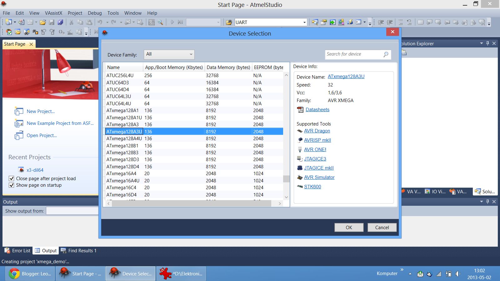 W kolejny kroku wybieramy procesor, jaki nasz interesuje. W module X3-DIL64 z Leon Instruments znajduje się ATxmega128A3U. W tym oknie możemy także ściągnąć aktualną dokumentację.