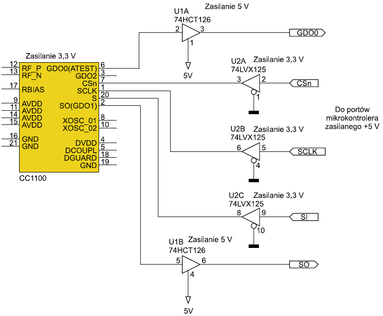 Mam zamiar podłączyć moduł radiowy CC1100 pod moją Atmegę32. Atmega jest zasilana napięciem 5V, natomiast moduł CC1100 napięciem 3,3V. W artykule z "Elektroniki praktycznej" znalazłem schemat takiego podłączenia: