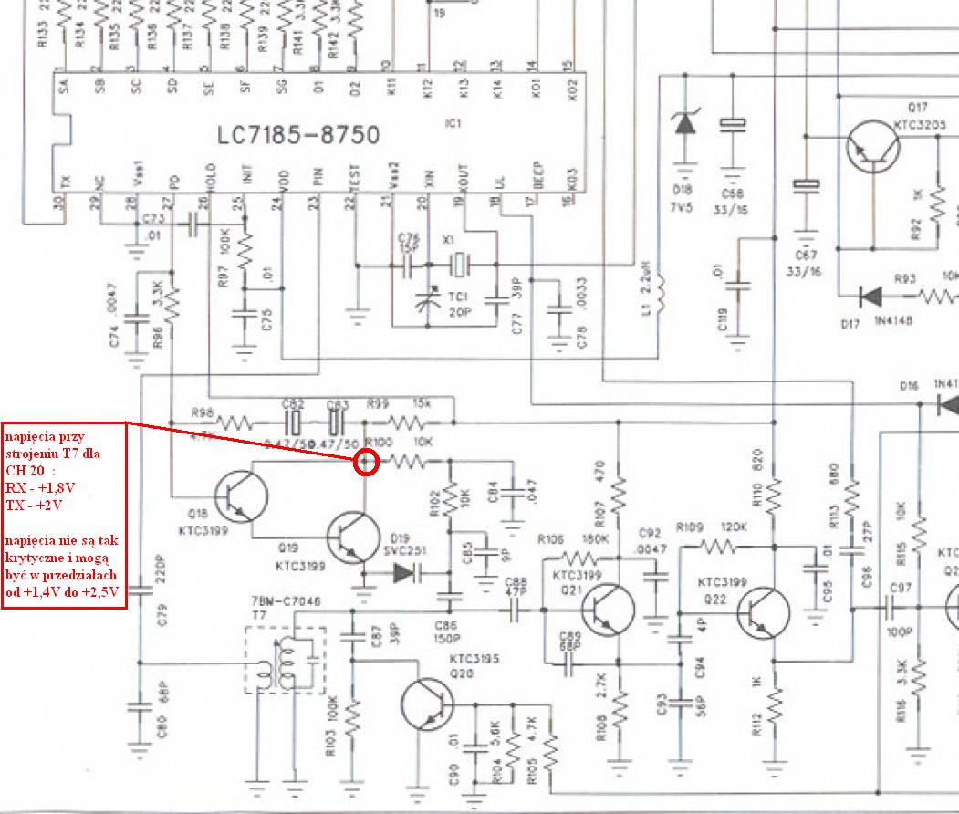 Otóż dostałem radio na stół, wymieniłem Q15 bo był uszkodzony i z tyłu jest taka blaszka osłaniająca nad 2SC2078 - odlutowałem ją szukając wcześniej usterki i teraz chciałem ją przylutować - zapominając, że radio jest włączone do prądu zrobiłem zwarcie emitera Q24 do masy i od tego momentu nadawania brak. Wymieniłem Q24 (dałem BC549 bo nie miałem lepszego pod ręką) - zwarcie miał w każdym kierunku, podmieniłem i nic - jest odbiór ale nadawania brak, pobór prądu 0,2A przy odbiorze i nadawaniu a wcześniej był przy nadawaniu na poziomie jakieś 0,5A. Może podam teraz pomiary jakie zrobiłem (częstotliwości zgrubnie odczytane z oscyloskopu).