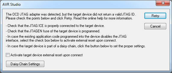 Po podłączeniu go do mojej płytki zapala się dioda "TX" oraz "Target". Próba skomunikowania AVR Studio ze sprzętem kończy się takim komunikatem oraz zgaśnięciem diody "Target":