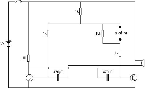 Jest to bardzo prosty detektor przeznaczony do zabawy, wykorzystujący jeden czynnik zmieniający się podczas mówienia nieprawdy - zmiana rezystancji skóry. Dźwięk generowany przez układ 500Hz do 3500Hz jest zależny od rezystacji skóry, która bywa bardzo zróżnicowana z przedziału od 10k do 500k. Reasumując jeżeli ktoś się denerwuje, rezystancja spada a to powoduje wzrost generowanej częstotliwości. Jako czujniki użyto dwa przewody przyłączone do dwóch palców jednej ręki. Zasilanie z baterii. Bz1 to zwykła blaszka piezo. Zbudowano na płytce uniwersalnej.