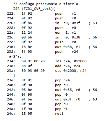 d. przełączenie na disasemblacje nadal wskazuje iż ostatnią instrukcją w przerwaniu jest instrukcja reti, co powinno ustawić flagę zezw. na globalne przerwania - niestety po tej instrukcji właśnie flaga jest zerowana.