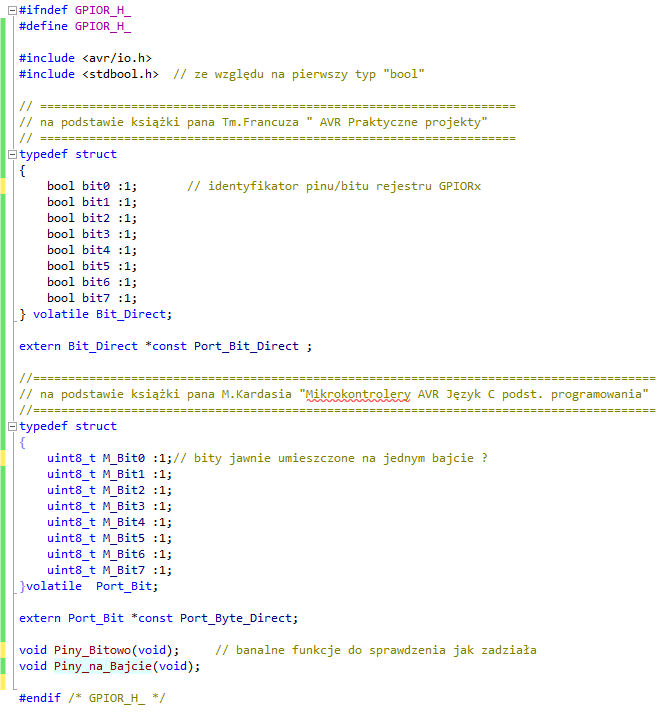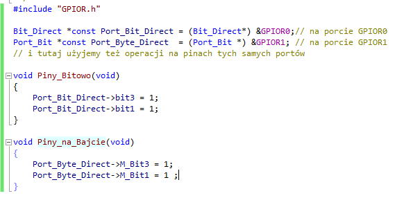 ps. druga wersja da się też w analogiczny sposób do pierwszej "zainstalować" na GPIORx , jednak czy będzie tak samo interpretowana, gdyż jedna struktura, to rzeczywiste pola bitowe , a druga to pole zmiennej 8-mio bitowej, fizycznie to to samo , czy jednak dla kompilatora też to samo?