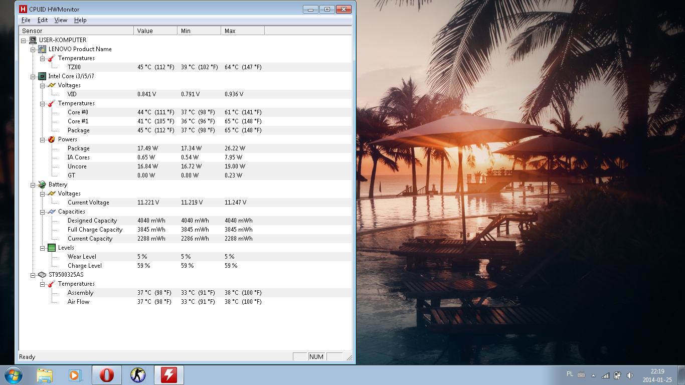 Laptop oczywiście stoi ponad 3cm na podkładce nad biurkiem, wylot odsłonięty.