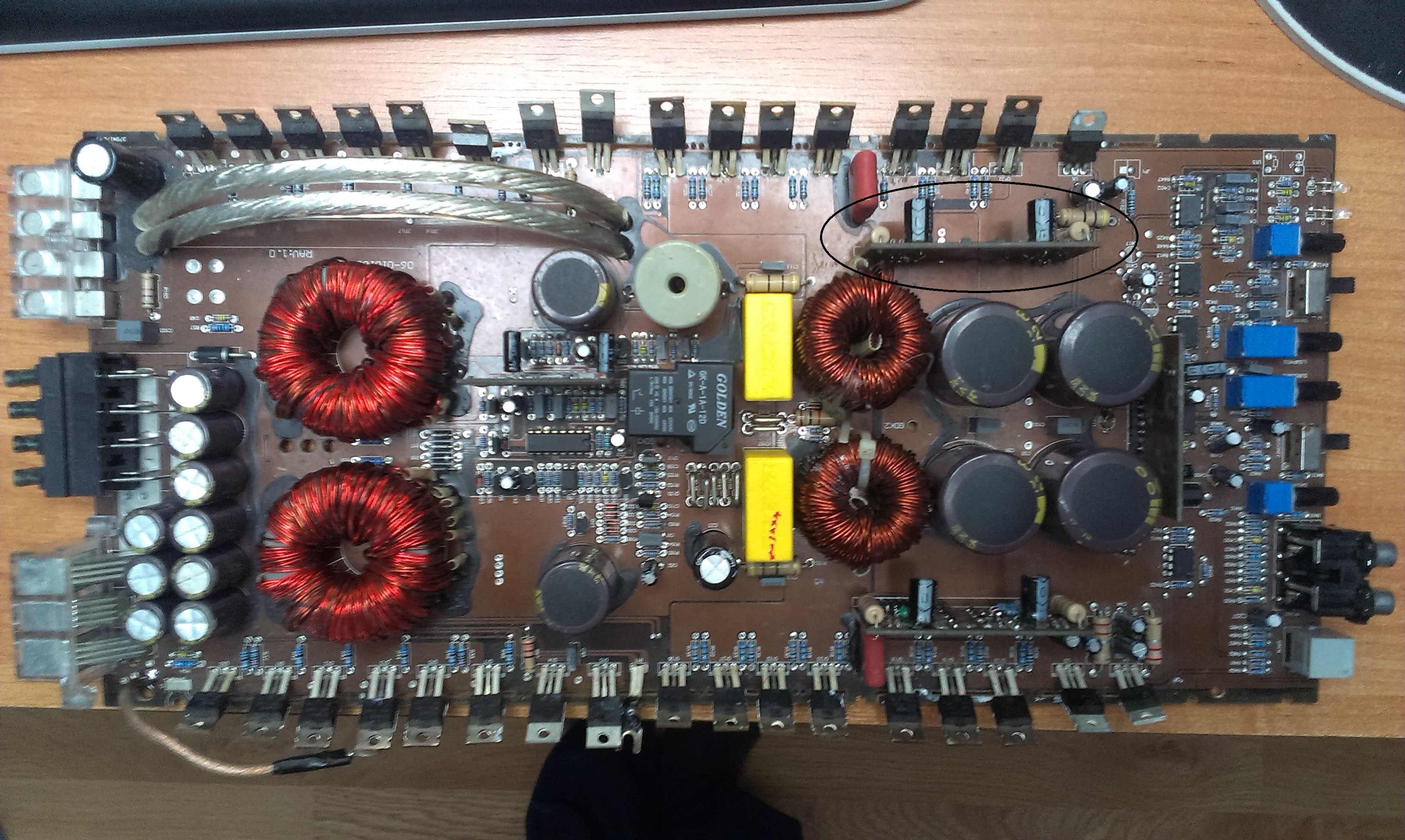 posiadam wzmacniacz samochodowy Peiying 1K76D. Po podłączeniu zasilania i sygnału zapala się kontrolka "power", lecz na wyjściu nic się nie dzieje. Grzeje się tylko jedna z pionowych płytek (zaznaczona na zdjęciu).