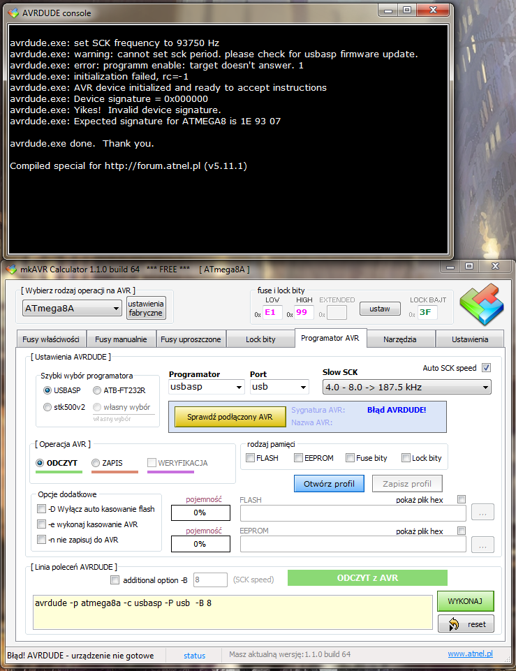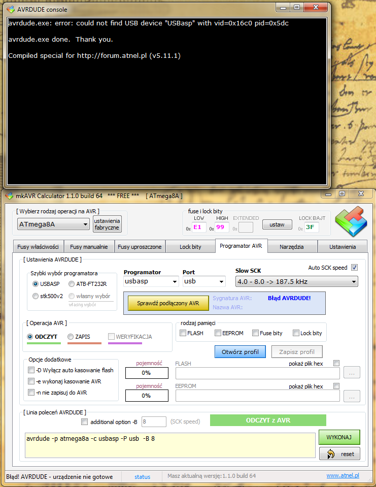 USB podłączone -> błędy związane z brakiem wykrycia mikrokontrolera